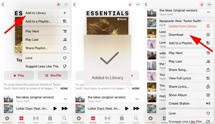 3. Suchen Sie den Song, das Album oder die Wiedergabeliste, die Sie auf Ihr iPhone laden möchten, tippen Sie auf die 3 Punkte in der oberen rechten Ecke und wählen Sie dann Zur Mediathek hinzufügen aus dem Menü.