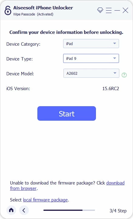 Klicken Sie auf die Schaltfläche „Starten" und warten Sie, bis das Tool die entsprechende iPadOS-Software für Ihr Gerät heruntergeladen hat. Wenn Sie eine gute Breitband-Internetverbindung haben, wird der Download schnell abgeschlossen sein.