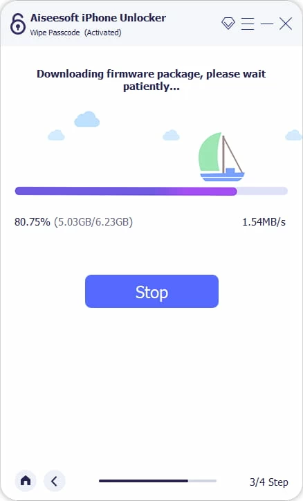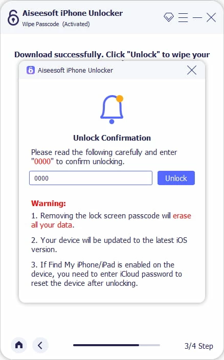Sobald die iPadOS-Software heruntergeladen ist, bestätigen Sie Ihre Entscheidung durch Eingabe von „0000" und klicken Sie auf die Schaltfläche „Entsperren", um den Prozess des Zurücksetzens Ihres iPad auf die Werkseinstellungen zu starten.