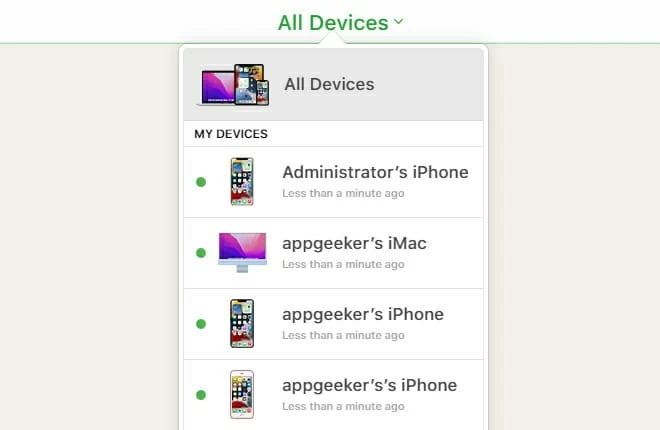 3. Suchen Sie im Menü Alle Geräte oben in der Mitte des Bildschirms das Gerät, das nicht verfügbar ist, und wählen Sie es aus.